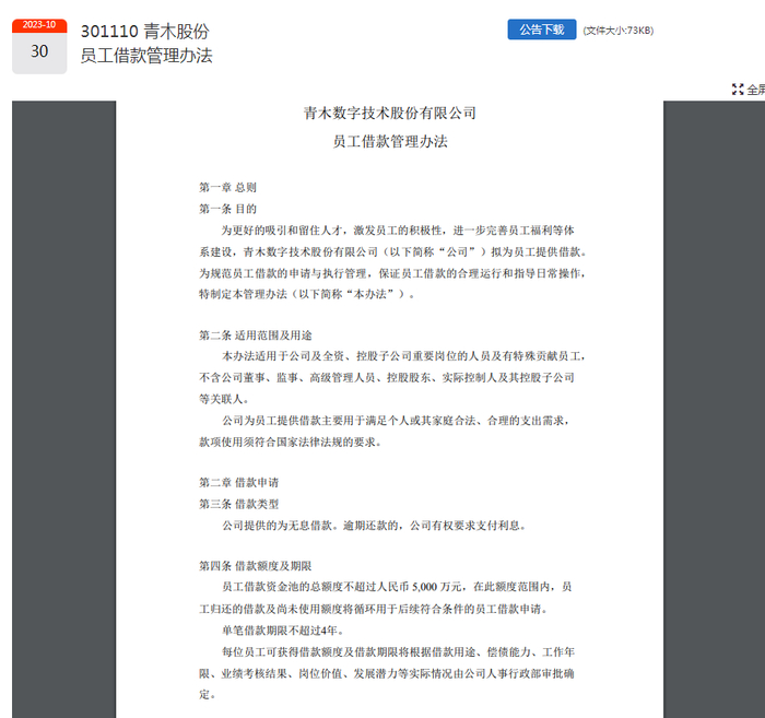 美芯晟不是近期唯一一家为员工提供大额借款的公司。10月29日晚,青木股份(301110)公布的《员工借款管理办法》显示,为更好的吸引和留住人才,激发员工的积极性,进一步完善员工福利等体系建设,公司拟为员工提供借款。
