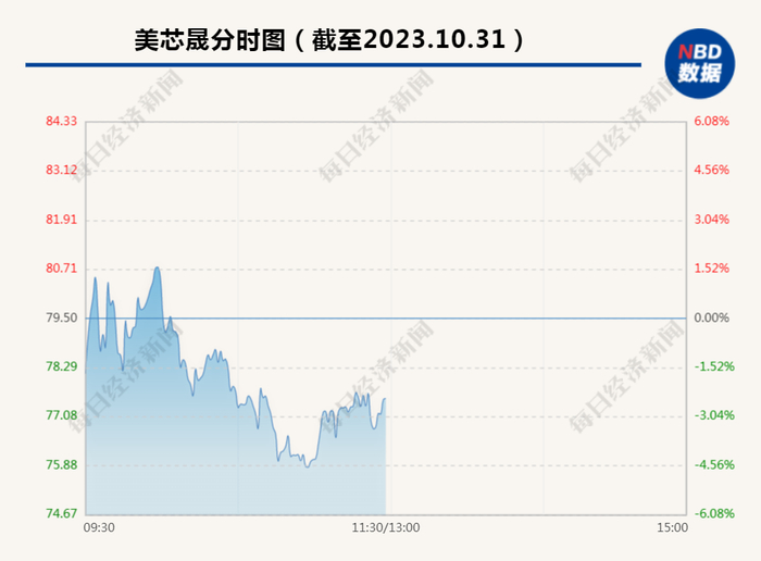 截至10月31日午盘,美芯晟报77.53元/股,跌幅2.48%,市值62.03亿元。