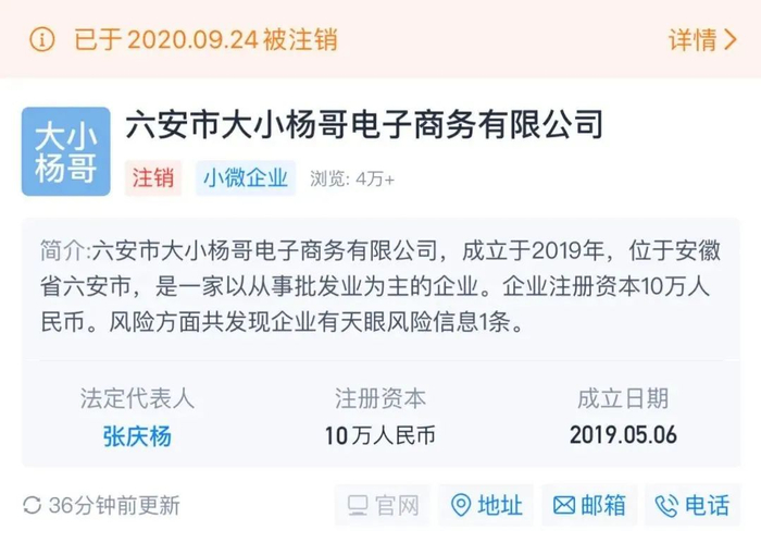 2019年,小杨哥注册成立了六安市大小杨哥电子商务有限公司,结果不到1年就倒闭了。