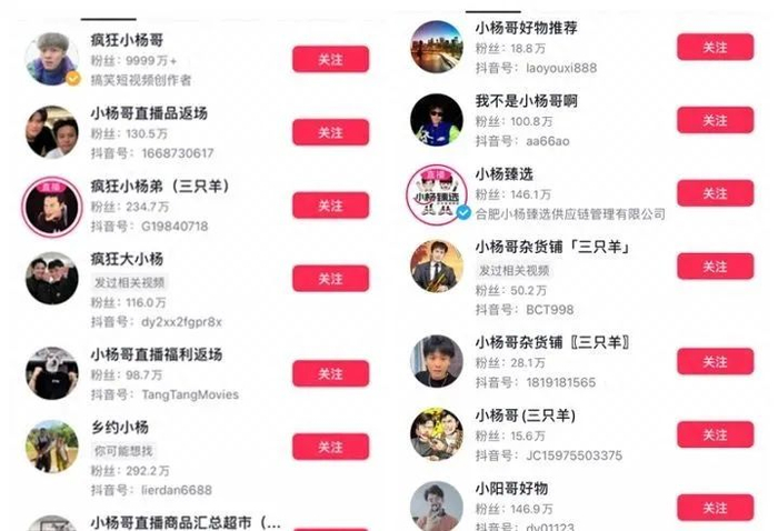 现在搜“疯狂小杨哥”几个字,与之关联的账号数以百计:“疯狂小杨弟”、“疯狂大小杨”、“疯狂小洋哥”、“我不是小杨哥”……