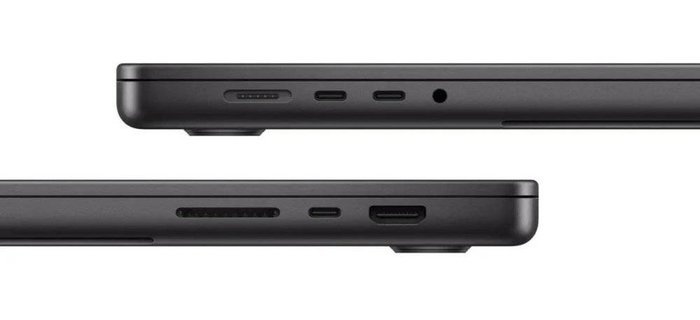 14 英寸 MacBook Pro 标配霹雳 4 端口、以及 HDMI 端口、SDXC 卡插槽、耳机插孔和 MagSafe 3 端口。