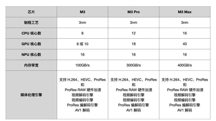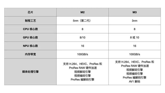 新的 M3 基础款芯片与 M2 芯片配置相同,有 8 核心 CPU(4 个高性能核心和 4 个高能效核心)和多达 10 核 GPU 可选,但 M3 基础款芯片内存带宽不变,依旧是 100 GB/s。