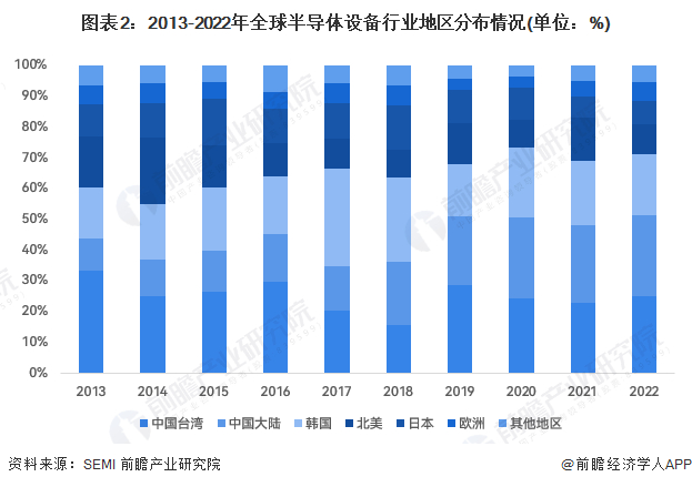 从趋势角度分析,2013-2022年,中国台湾地区半导体设备销售占比整体呈现下降趋势,中国大陆地区整体呈现上升趋势,并于2022年销售占比达到第一,韩国销售占比整体也呈现上升趋势,其余地区例如日本、北美等,均呈现下降趋势。