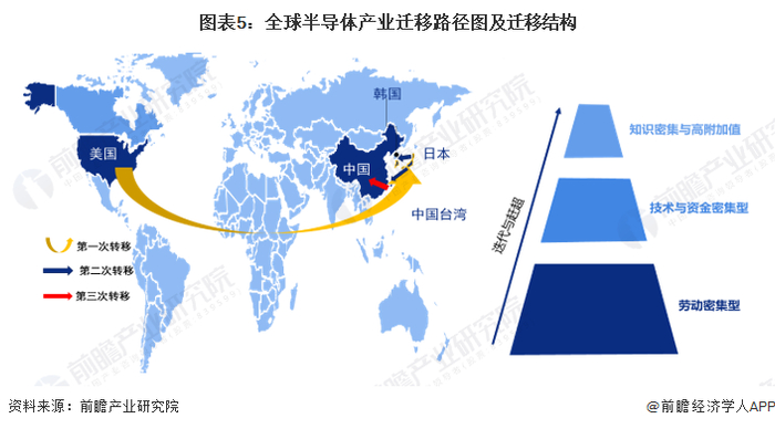 按照雁行模式理论,半导体产业迁移的承接国均是经历了本国半导体产业由劳动密集型产业发展成技术资金密集型产业,最后成为知识密集型产业的一个过程。全球半导体产业共经历三次产业迁移:20世纪80年代,由美国本土向日本迁移,成就东芝、松下、日立等;20世纪90年代末期到21世纪初,由美国、日本向韩国、中国台湾迁移,造就三星、海力士、台积电、日月光等;第三次,是中国台湾向中国大陆迁移。