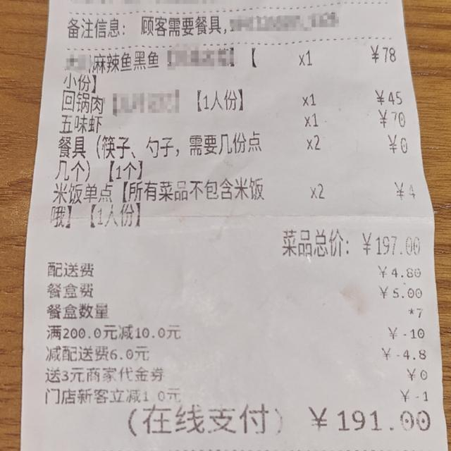 上周五中午,齐老板手机接到电话,来电人说自己点的外卖少了2份米饭。齐老板核对了下,发现是11点多的一份订单,一共点了3个菜:麻辣黑鱼、回锅肉、五味虾,都是店里的招牌菜,另外还点了2份米饭2份餐具,总价197元,算上配送费、餐盒费,减去满减优惠和红包,客人一共支付191元。