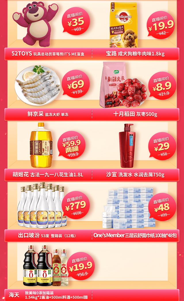 京东超市官方直播间“真五折”爆款商品覆盖休食水饮、酒类、生鲜、预制菜、粮油调味、家清、个护、母婴、玩具乐器、宠物、鲜花园艺11大品类,还有多款1元抢购福利品,全程超市卡送不停,茅台飞天 53%vol 500ml 贵州茅台酒(带杯)1499元,18点预约,20点抢购。