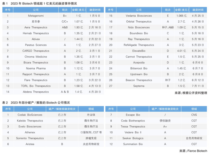 一级市场上,全球Biotech大额融资数量也在逐渐增加。今年一季度,可称得上大额融资的事件只有两起,分别为Cargo Therapeutics 2亿美元的A轮融资和Aera Therapeutics 1.93亿美元的A&B轮融资。今年二季度,大额融资接连不断,包括Orbital Therapeutics的A轮2.7亿美元融资、ReNAgade Therapeutics的A轮3亿美元融资,以及ElevateBio的D轮4.01亿美元融资。