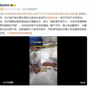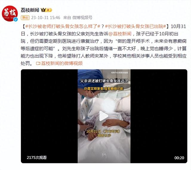 10月31日,长沙被打破头骨女孩的父亲刘先生告诉@荔枝新闻,孩子已经于10月初出院,但仍需要定期到医院进行康复治疗,因为“做的是开颅手术,未来会有患癫痫等后遗症的可能”。刘先生称孩子出院后情绪一直不太好,晚上觉也睡得少,计算能力也出现下降,他希望除打人教师宋某外,学校其他相关涉事人员也能受到相应处罚。