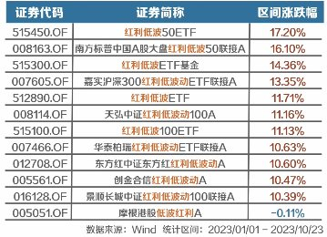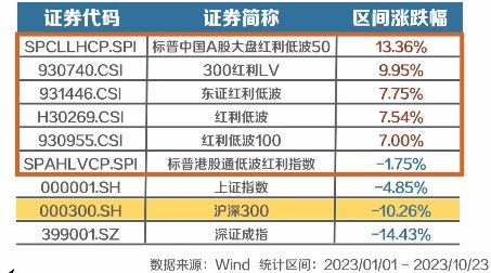 今年以来(截至10月23日),沪深300下跌了10.26%,同期红利低波指数中,标普中国A股大盘红利低波50涨了13.36%,300红利LV涨了9.95%。