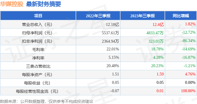 据证券之星公开数据整理,近期华媒控股发布2023年三季报。根据财报显示,本报告期中华媒控股增收不增利。截至本报告期末,公司营业总收入12.4亿元,同比上升1.82%,归母净利润4833.47万元,同比下降12.72%。按单季度数据看,第三季度营业总收入4.36亿元,同比上升3.82%,第三季度归母净利润-809.0万元,同比下降159.29%。