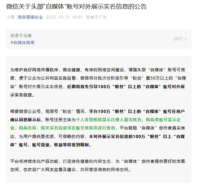 同日,微信公众号“微信珊瑚安全”发布公告,微信将分批次引导“粉丝”量50万以上的“自媒体”账号对外展示实名信息,近期将首先引导100万“粉丝”以上的“自媒体”账号对外展示实名信息。公告全文如下: