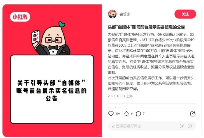 同日,小红书官方发布公告,宣布将分批次分阶段引导粉丝量在 50 万以上的“自媒体”账号进行前台实名信息展示。首批将向粉丝量在 100 万以上的“自媒体”账号发出站内信,并征求用户同意后在其个人主页展示实名认证的真实姓名。