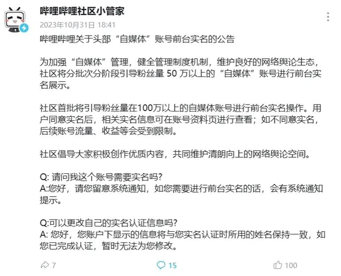 B站官方发布公告,宣布将分批次分阶段引导粉丝量 50 万以上的“自媒体”账号进行前台实名展示。首批将引导粉丝量在 100 万以上的自媒体账号进行前台实名操作。