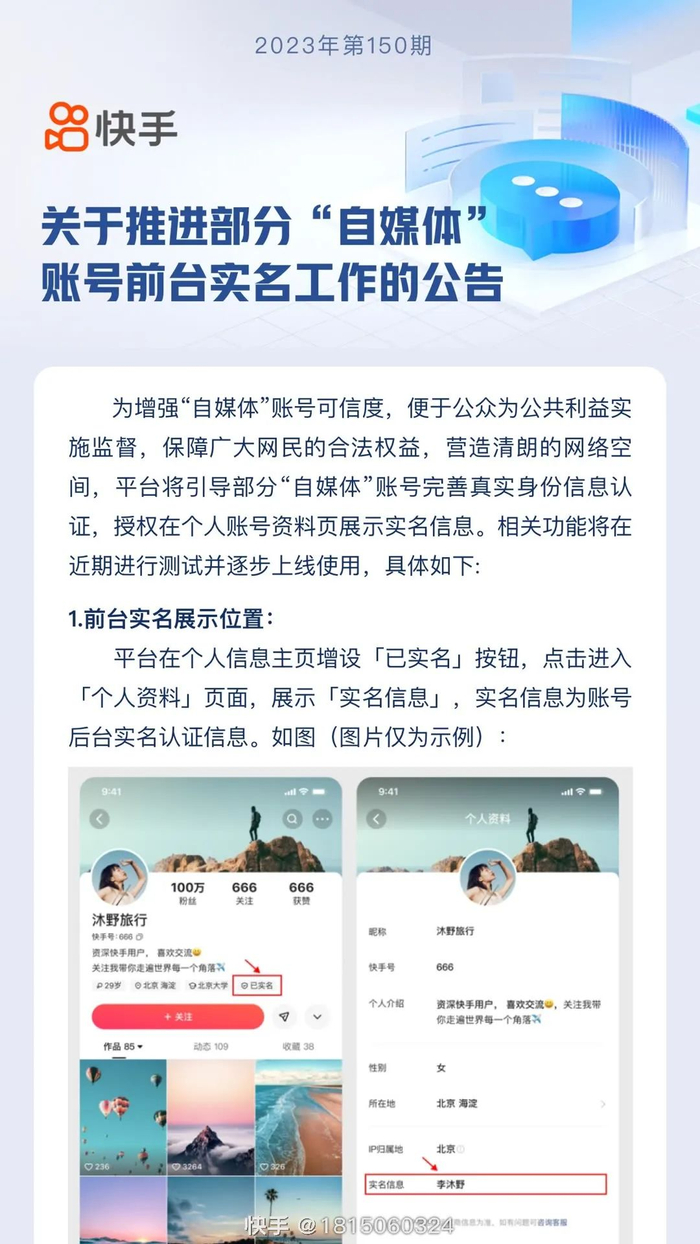 10月31日,快手官方发布公告:平台将引导部分“自媒体”账号完善真实身份信息认证,授权在个人账号资料页展示实名信息。相关功能将于近期进行测试并逐步上线使用。根据公告,前台实名账号范围为:涉国内外新闻、社会热点和医疗、司法等专业领域,粉丝量在50万以上的“自媒体”账号,将分批次、分阶段收到相关通知,可根据通知提示进行操作,征询同意后在个人账号资料页展示实名信息。快手表示,首批将针对粉丝量100万以上的相关领域自媒体账号发送通知。主要分享个人日常生活的账号,不在前台实名范围。