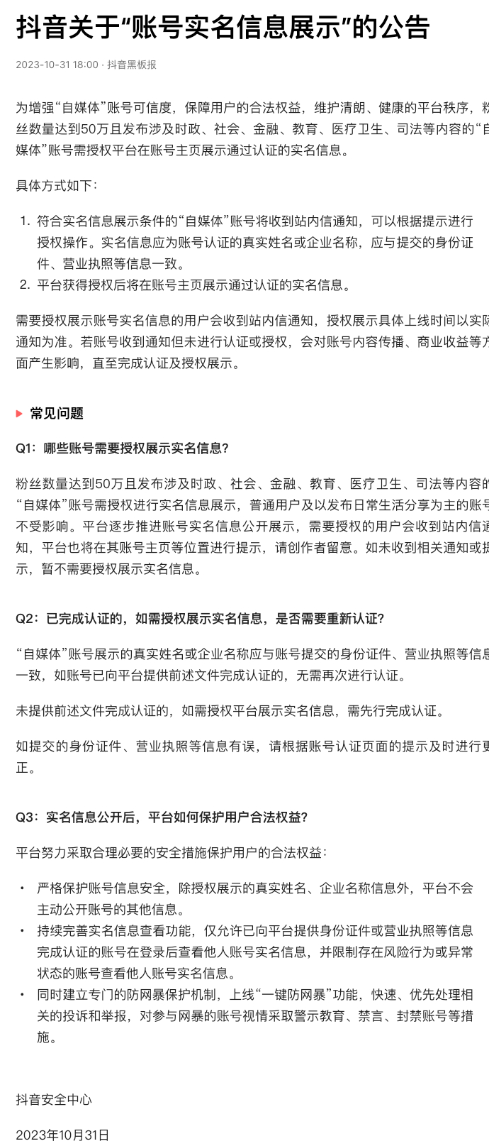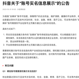 10月31日,抖音安全中心在社交平台发表公告,粉丝数量达到50万且发布涉及时政、社会、金融、教育、医疗卫生、司法等内容的“自媒体”账号需授权进行实名信息展示,普通用户及以发布日常生活分享为主的账号不受影响。平台逐步推进账号实名信息公开展示,需要授权的用户会收到站内信通知,平台也将在其账号主页等位置进行提示。