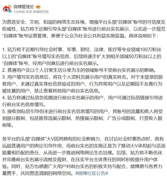 此外,据微博@微博管理员 消息,微博31日发表公告,为营造安全、文明、和谐的网络生态环境,增强平台头部“自媒体”账号的可信度及权威性,站方将于近期引导头部“自媒体”账号进行前台实名展示,以此进一步规范“自媒体”账号运营管理,更便于公众为社会公共利益实施监督。