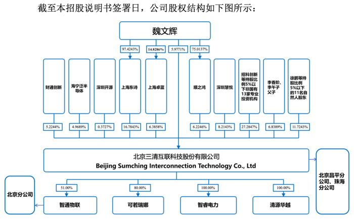 目前,三清互联无控股股东,实控人为魏文辉。其直接持有公司5.98%的股权,通过持有上海东诗97.42%份额并担任其执行事务合伙人进而控制公司16.78%的股份,通过持有上海卓蓝14.83%份额并担任其执行事务合伙人进而控制公司6.39%的股份,通过持有顺之鸿 75.01%份额并担任其执行事务合伙人进而控制公司6.22%的股份,因此合计控制35.37%的股份。