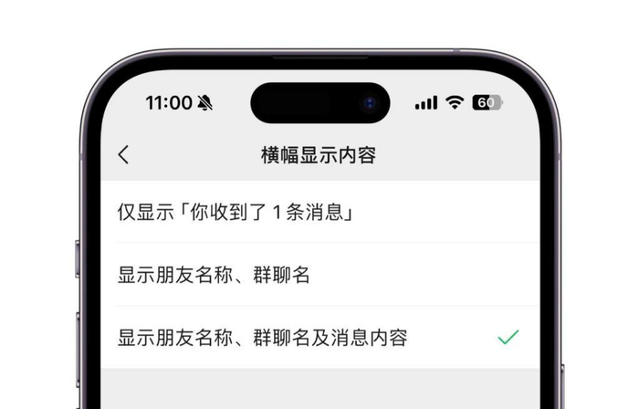 如果设置了显示朋友名称、群聊名,那么在微信内的横幅是下面这样的,只会显示朋友的名称或者群聊的名称。