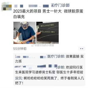 “2023最火的项目,男士一针大,微球胶原蛋白填充”,“效果震撼,实力派”。上述措辞来自今日一张在各大社交平台广泛流传的朋友圈截图,该截图显示发布者为某医疗门诊部,让诸多吃瓜群众感叹,“(整形手术)终于卷到男人XX了!”