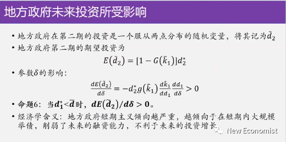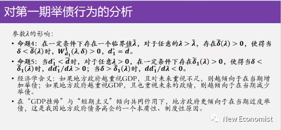 第五个命题是说当你的λ,就是它的 GDP的重视程度还不是那么高,这个时候在一定条件下你就可以推出来,你政府越关注GDP,你第一期借的钱越多,这和你GDP的重视程度是正相关的。