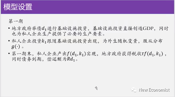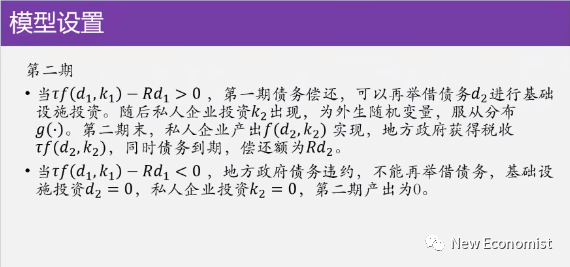 说地方政府过度举债,表面上看这是一个短期行为,可能借很多钱,但是你长远来看,你第一期举都举债多了,第二期可能借不来钱了,你两期跟在一块,你说不定整体的融资的能力还下降了,这个是我们的一个核心的说法。这个里面我们一个很简单的两期的博弈论模型,博弈论模型的最关键的一个主题,这个假设是什么?