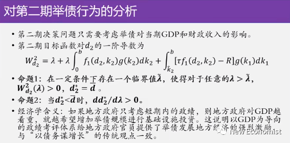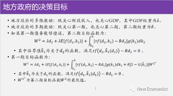 所以理性的地方政府他既关心 GDP也关心税收,你看第一行,你的第二期的目标函数是什么呢?你既关心 GDP,GDP权重是λ, GDP是λ乘以d2,d2是GDP的一部分,你第二期如果能借到d2的话,d2当期搞投资。