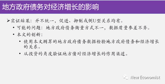 倒数第二个话题,到底地方债务对经济发展有什么影响,我们为此我们做了一系列的实证分析,我们认为债务高和低和经济增长有可能是正向关系,有可能是负向关系,什么理论都可以讲,你如果不谈这些理论的话,也可能是U型关系。