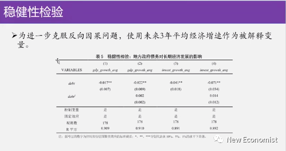 好了,那么为了再进一步的克服反向因果关系,你们能不能认为是不是反向影响?是不是GDP增长速度反过来影响举债水平?我们用了未来我们用未来平均三年的增长速度作为被解释变量,就是我们把今年的债务水平用来解释未来三年的平均的增长速度,你看仍然是负的,看你看没有债务和未来三年的GDP增长速度是负的,你是个增加10%的债务的话,那么你的 GDP增长速度未来三年会降0.1%,然后TFP会降0.7%,你看这是仍然是负向的好吧?