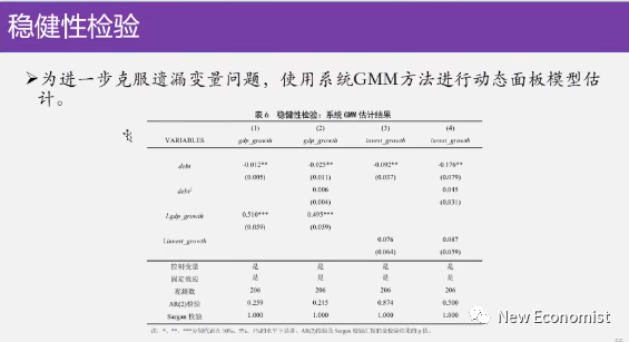 好的,然后我们最后用了GMM的方法来进行一个就作为稳健性我们怕遗漏的变量,我们进行动态的面板模型的回归,基本结论也是非常相近的,非常相近,你看都是这个债务都是负的,债务的平方项是不显著的。