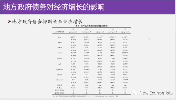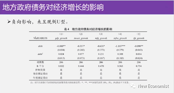 你看我们第一个回归的表,我们发现你看第一个是地方政府债务对经济增长的影响,你看各个被解释变量是 GDP增长速度、投资增长速度,固定资产投资增长速度,制造业增长速度和基础设施投资增长速度,而且第二行第二列是总投资增长速度,第四列是基础设施投资增长速度,第五列是TFP,你看总的来讲,所有的回归里面这个债务都是一个负的显著的一个变量,我就滞后一期的。