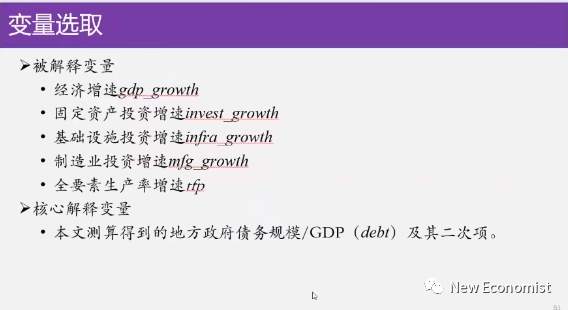 所以我们从实证的角度来研究,地方债对未来经济增长的影响,我们首先搞了一个省级的面板数据,这是30多个省市自治区和13到19年的7年的一个面板数据,我们用了Wind数据库,我们用了cic等数据库,那么我们做了两组回归,第一组都是固定效益,第一组就是简单的一个线性回归,我们把债务和投资额GDP增长速度进行回归,GDP增长速度和债务作为被解释变量,债务作为前期的债务滞后一期的作为解释变量,当然很多控制变量是z、i、t,第二组回归我们担心我们认为有这种可能是U型关系,债务和投资和GDP增长可能是U型关系,我们加了平方项。