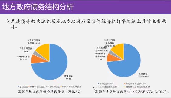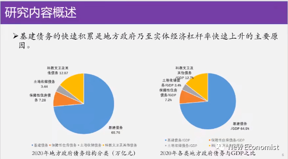 你看一下左边,我们这个债务是按总量算的,你看基建是蓝色的部分,基建债务大概在65.76万亿,基建债务按比例算除以GDP能够达到64%,所以基础设施建设是债务的主要的来源恐怕也不奇怪。