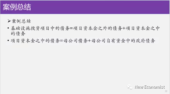 所以我们总结一下基建设施投资项目中的债务等于项目资本金之外的债务,再加上资本金中间的债务,你把这两个搁在一块,资本金中间也是债务,是母公司的债务,加母公司自有资金中的政府债务,就是母公司他去借了钱投到子公司,那么母公司它资本金中间还有政府借的钱,这个我应该讲明白了吧?