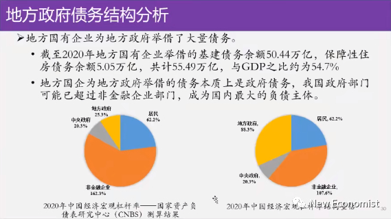 2020年我们国家地方债务的总额我们算出来接近90万亿,跟当时的GDP相比为88%,这个规模明显比现有的大部分研究者的估算的值要高,你比如说国际货币基金组织或者世界银行,他们一般认为在60万亿左右,那么占GDP的比重是50%多,我们算出来比他高,原因就是我们算了镶嵌式的结构,而且我们把地方政府下面的所有的国有的投资平台的债务都拉进来,因为从本质上讲,国有投资平台的债务就是地方政府的债,地方政府跟地方国有投资平台就是一家,我们坚定的认为不能分开,这是一家,它是一回事。