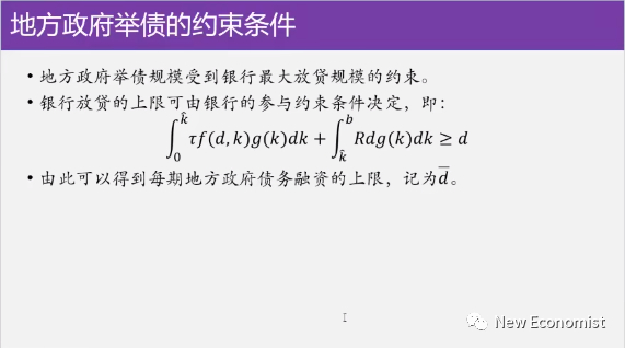 这里面还有一个要讲的,银行或其他金融机构把钱借给地方政府也不傻呀,他必须要保证他那个钱能收回来,银行也要算一个他能贷款的量,这个函数他表示什么呢,银行从地方政府得到的反馈的这个钱,他最多能从地方政府拿到多少钱,一部分是利率,一部分是政府得到的税收,这两部分必须要保证我这个银行不亏损,银行不亏损的条件下,银行愿意借钱给你,这就是是我们的一个约束条件,就是政府不可能无限制的在第一期或者第二期借钱,他必须要满足银行的不亏损的一个约束条件,这个模型是这么干的。