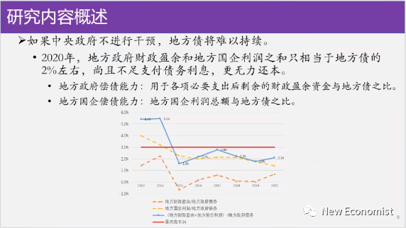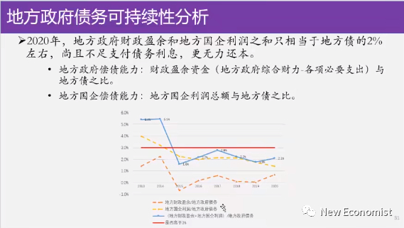 这张图我已经给大家看过了,你看蓝线,蓝线到2015年还可以,你看到2015年前我们的地方政府的还债能力还可以,能到5.5%。5.5左右就是2015年之前地方政府的财政盈余加地方国企的盈利还能还相当于本地债务的5.5%的这么一个利息,基本上你还能持平,5.5的利息还可以。