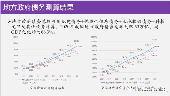 你比如说以2020年为例,我们认为2020年全国的地方债总额它是89.53万亿,上限是100万亿,下限是75万亿都是比较高的。那么右边这个图是地方政府债务与GDP之比,那么根据我们这个算法,2020年地方债务总额我们认为比较可靠的是89.5万亿,接近90万亿,与GDP之比是88%,这是这么一个量。