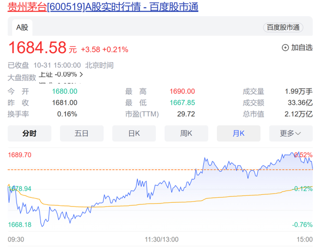 自2021年2月登顶2627.88元/股之后,贵州茅台股价便一路走低,目前每股已经跌掉近千元,截至到2023年10月31日收盘时,该股报收于1684.58元/股。其中,10月19日贵州茅台大跌近6%,20日盘中一度跌至1616.25元/股,创2021年12月以来的新低。