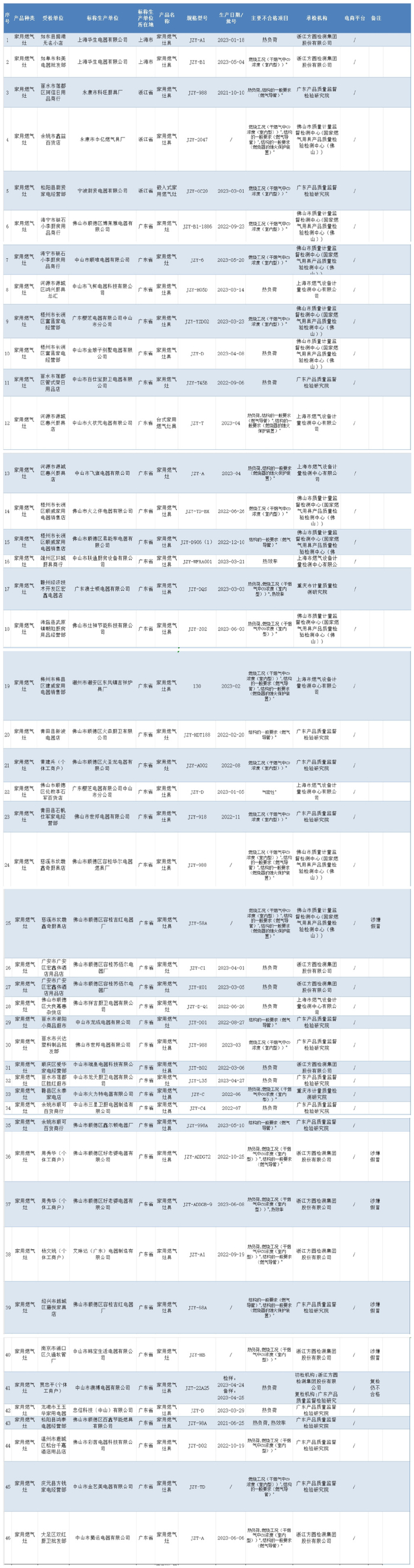 42. 标称忠信科技(中山)有限公司生产的家用燃气灶具,规格型号:JZY-D,主要不合格项目:热负荷;