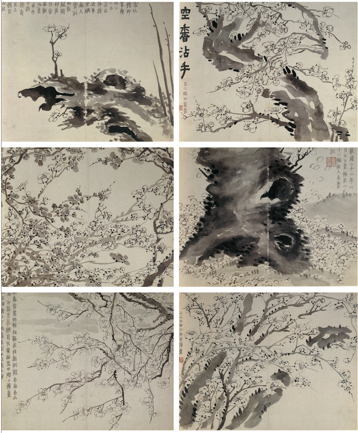 文人艺术家咏梅,还有一种倾向,就是要将梅打造成铁石化身,他们似乎要将梅冷冻起来——岁月流淌,万化皆殊,而被冷冻的梅是确定的、不变的。咏梅人常说这里有一种“古意”,蕴藏着古道热肠。中国艺术中这“古梅”情结,如佛经上说那皱中不皱的真实,是人们所追寻的不坏真身。“山中古仙子,无言春寂寥”,古梅,将人间的真性冷冻起来,保留在寂寥中。明乎此,你就会理解《芥子园画谱》谈画梅“一要体古,屈曲多年。二要干怪,粗细盘旋。三要枝清,最戒连绵”等说法的思想因缘。