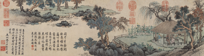 在中国艺术中,梧桐是高逸精神的象征物。明崔子忠有《云林洗桐图》(图10),画倪云林洗桐事。画中参差嶙峋假山旁,有青桐一株,昂然挺立。青桐下有一童仆持刷,清洗梧桐。中段着一士人,飘然长须,衣着洒落,制度古雅,当为云林。云林在无锡的清阁,雅净非常,阁外碧梧掩映,他常常让人洗濯梧桐。秋风一起,梧桐凋零,他又嘱家人以杖头缀针,将叶挑出,不使坏损,挖香冢掩埋。故宫博物院藏云林《梧竹秀石图》,画中部有一假山,孤迥特立,绿竹猗猗,后面以一梧桐作背景,影影绰绰。正如张雨题诗所云:“青桐阴下一株石,回棹来看兴未消。展图仿佛云林影,肯向灯前玩楚腰。”青桐,透出明清以来文人艺术追求的“云林规范”。
