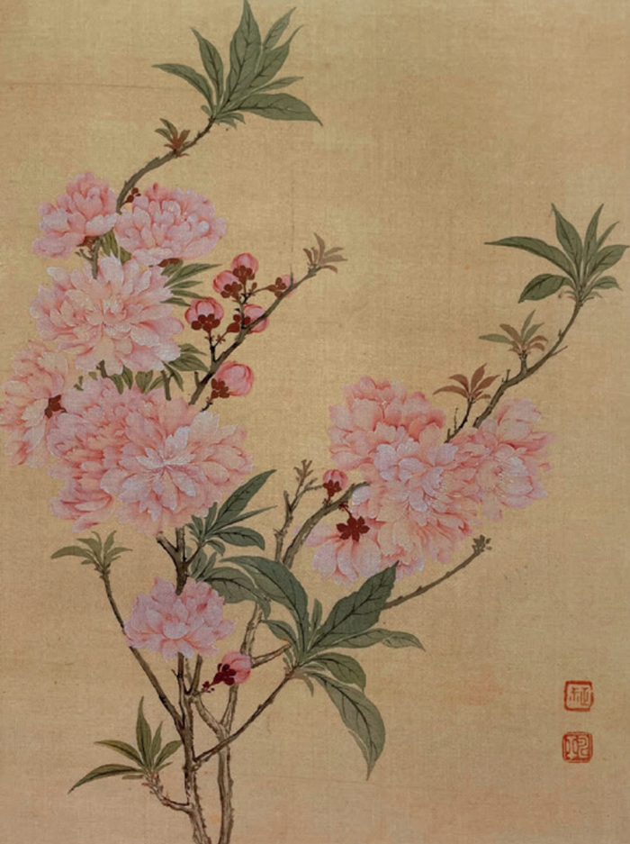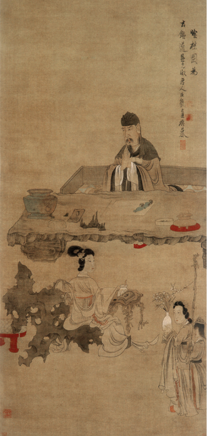 陈洪绶有《吟梅图》(图12),古色古香,一高士坐在长长石案前,紧锁眉头,双手合于胸前,做沉思状。案上放一张空纸,以铜如意压着,毛笔从笔架上抽出,砚台里的墨也已磨好,似乎好句已从胸中涌出。他对面坐着一位女子,当是高士的弟子,女子注视画面一侧的女仆;女仆手上举着花瓶,布满冰裂纹的古瓶里插着梅枝,白色的嫩蕊正绽放,似乎可以嗅到梅花的香气。在高古的世界里,两人作诗作画,各自吟出他们心中的梅。老莲借着梅白桃红,从时间的挣扎中跳出,从历史的负累中跳出。