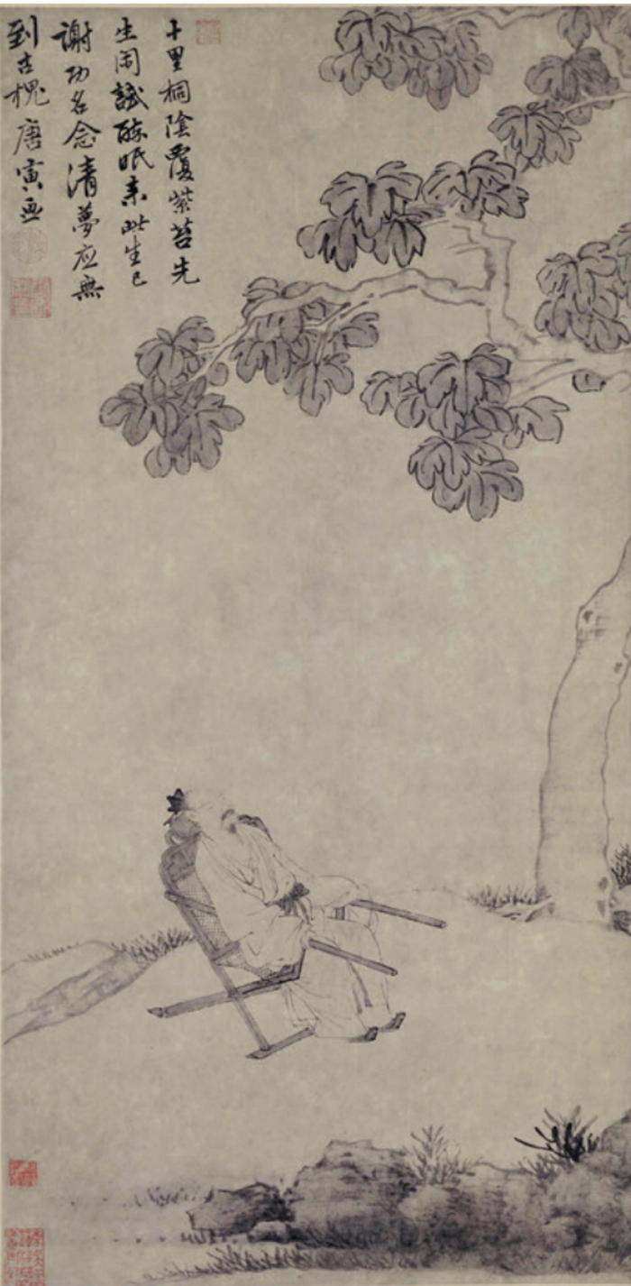 唐寅有一幅《桐阴清梦图》(图11),画一人于青桐下清坐入眠,梦者面带微笑。唐寅题有一诗于其上:“十里桐阴覆紫苔,先生闲试醉眠来。此生已谢功名念,清梦应无到古槐。”唐李公佐《南柯太守传》载,淳于棼梦到槐安国,娶了漂亮的公主,当了南柯太守,享尽富贵荣华。醒后才知道是一场大梦,原来槐安国就是庭前槐树下的蚁穴,所谓“一枕南柯”。唐寅不画古槐下功名欲望梦的破灭,易之以桐阴下的清梦,梦到一个清清世界中去,到一个没有烦恼的世界中去。滔滔天下,熙熙而来,攘攘而去,利欲熏心,蝇营狗苟,肮脏不已,少有清净,他要梦中寻,他的梦在青桐下。