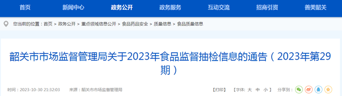 中国质量新闻网讯 据广东省韶关市人民政府网站2023年10月30日消息,韶关市市场监督管理局发布关于2023年食品监督抽检信息的通告(2023年第29期)。