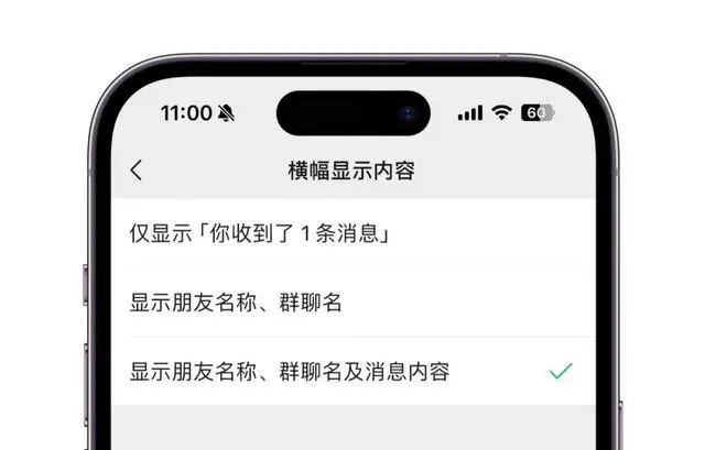现在可以设置横幅显示内容,可选择仅显示「你收到了1条消息」,效果如下,只会提示有1条消息,不会显示任何的消息内容。