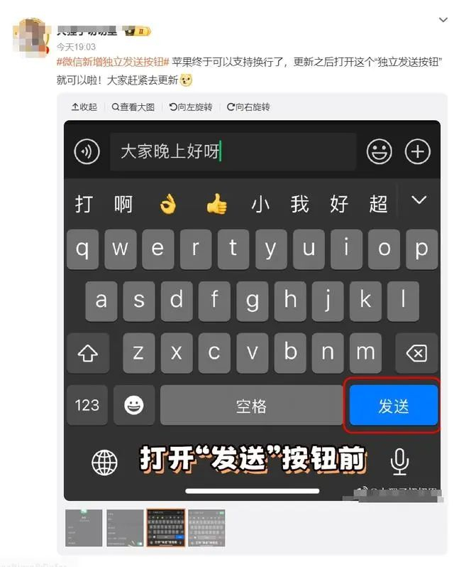 开启后,iPhone自带输入法原来的“发送”变成了“换行”,对话框右侧是发送键,可以实现一键回车换行了。对iOS微信+苹果自带输入法用户来说属实是史诗级更新了。