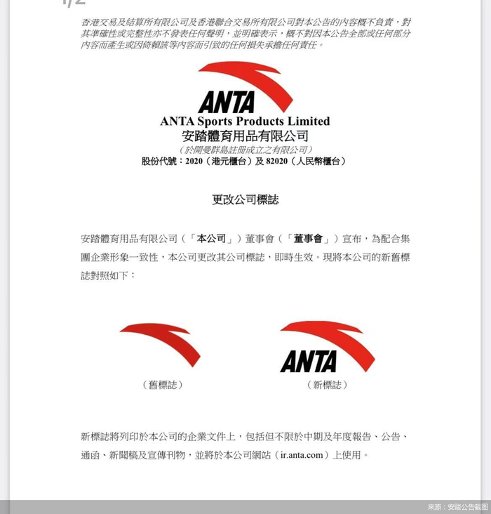 logo换新?安踏回应:非也,只为规范使用!10月31日晚,安踏体育港交所发布公告称,为配合集团企业形象一致性,公司更新了其公司的标识(logo)使用规范,即时生效。新标志将列印于公司的企业文件上,包括但不限于中期及年度报告、公告、通函、新闻稿及宣传刊物,并将于公司网站上使用。根据安踏发布的公告,新logo在原logo基础上增加了品牌字母,没有太大变动。