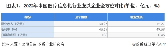 目前卫宁健康和创业慧康是国内医疗信息化行业的领先企业企业。从收入规模来看,卫宁健康2022年营业收入达30.93亿元,远高于创业慧康营收规模;从毛利率来看,卫宁健康毛利率为43.69%,低于创业慧康的毛利率水平。
