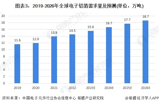 电子铝箔是通过对高纯铝锭进行一系列压延、清洗及切割工序等加工而成的一种铝箔,是生产铝电解电容器的关键原材料。根据中国电子元件协会信息中心公布的数据,2019-2022年全球电子铝箔需求量逐年增长,2022年全球电子铝箔需求量达到14.5万吨。预计到2026年全球电子铝箔市场需求量将达到18.7万吨。