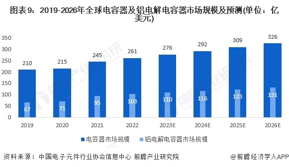 从市场规模来看,受新能源汽车、工业控制、5G商用、新型充电技术、汽车电子化等新兴产业快速发展的推动,产品持续推陈出新,催生了对铝电解电容器及其主要材料新的需求,但作为铝电解电容器主要应用领域之一的消费电子出货量下降,导致电子领域对铝电解电容器需求减弱。2022年全球铝电解电容器及整体电容器市场规模分别达到103亿美元及261亿美元。预计2026年全球铝电解电容器及整体电容器市场规模将达到131亿美元及326亿美元。